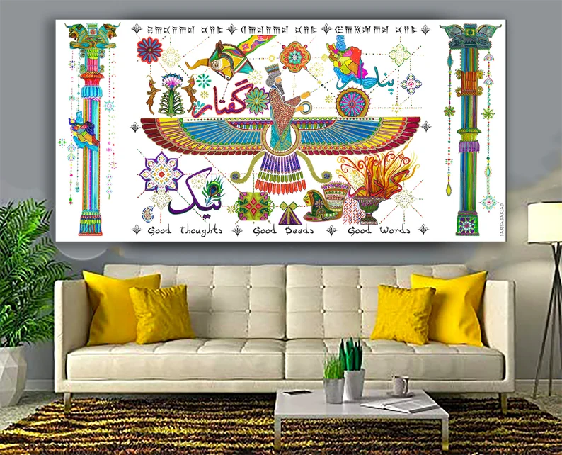 “The Creation of the Persian Empire” is an abstract visionary painting based on the three basic principles of humanity from 4,000 years ago in Persia. One should practice Good Thoughts, Good Words, and Good Deeds. Zoroastrians believe in one omniscient God, called “Ahura Mazda,” or “Farivahar, meaning “Wise Lord.” Ahura Mazda is the beginning and the end, the creator of everything which can and cannot be seen, the eternal, the pure, and the only truth..