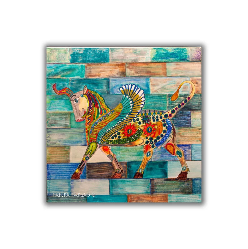 Jazzing up our heritage and history for the new generation of Persians, Iranians. A very cool painting that is both Modern and cultural. Lovely conversation artwork that is unique yet familiar. I like to call it the Persian unicorn although it is clearly a Bull.
