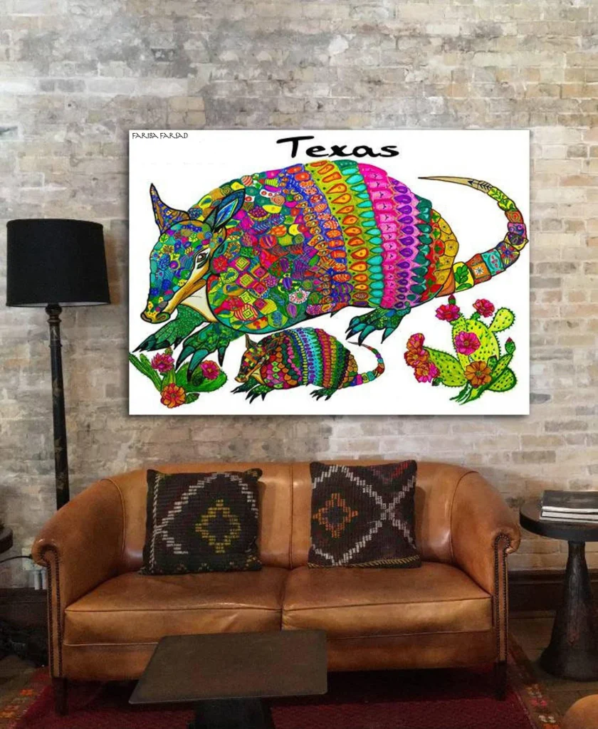 Texas Armadillo Spirit Animal Guide Abstract Art Painting Gallery Wrapped Canvas Print Colorful Wall Hanging, Bohemian Home Decor, Native American Totem Visionary Surreal Gypsy Psychedelic Mystic Shamanic Modern Contemporary Simple Western Art, Soulaya Designs, Fariba Farsad